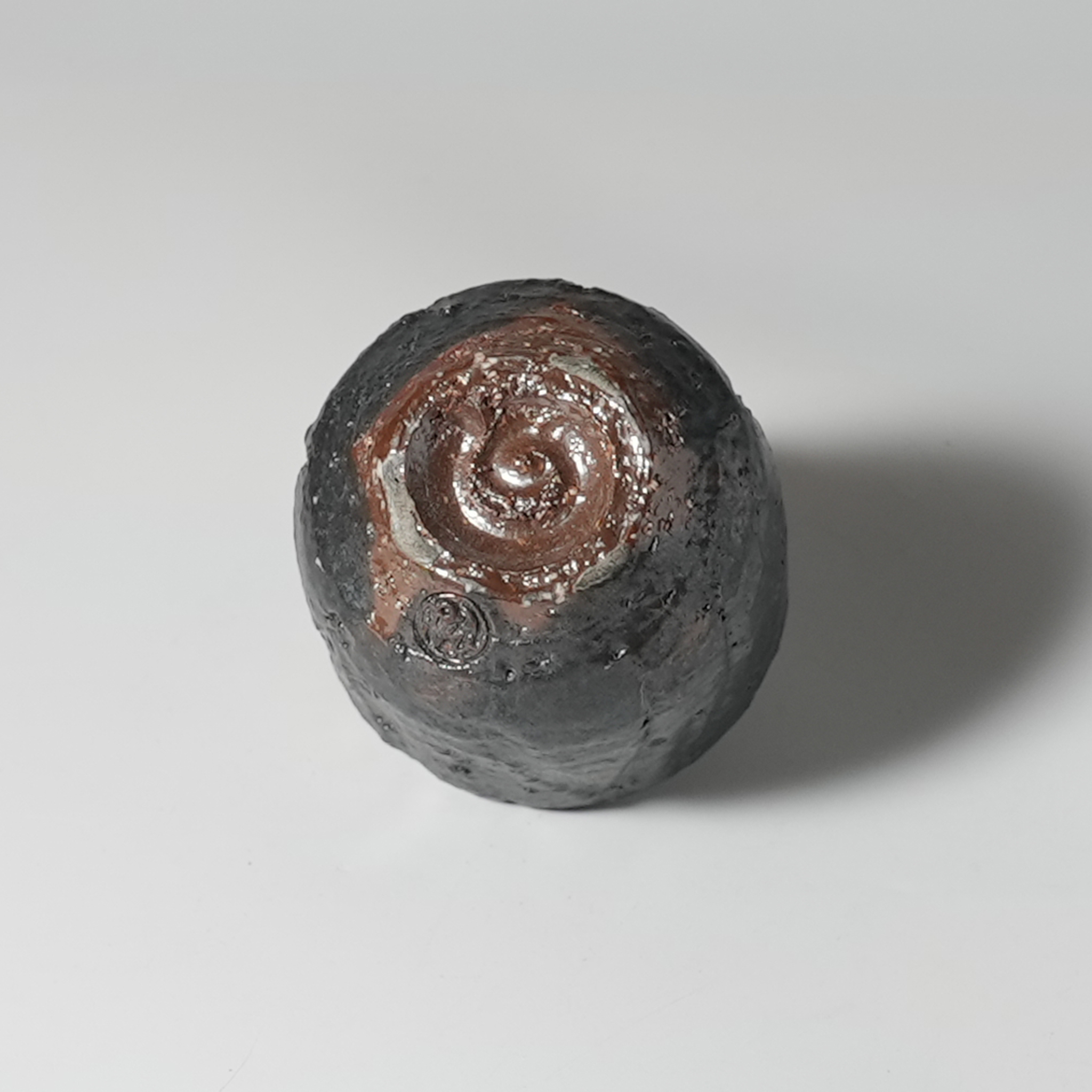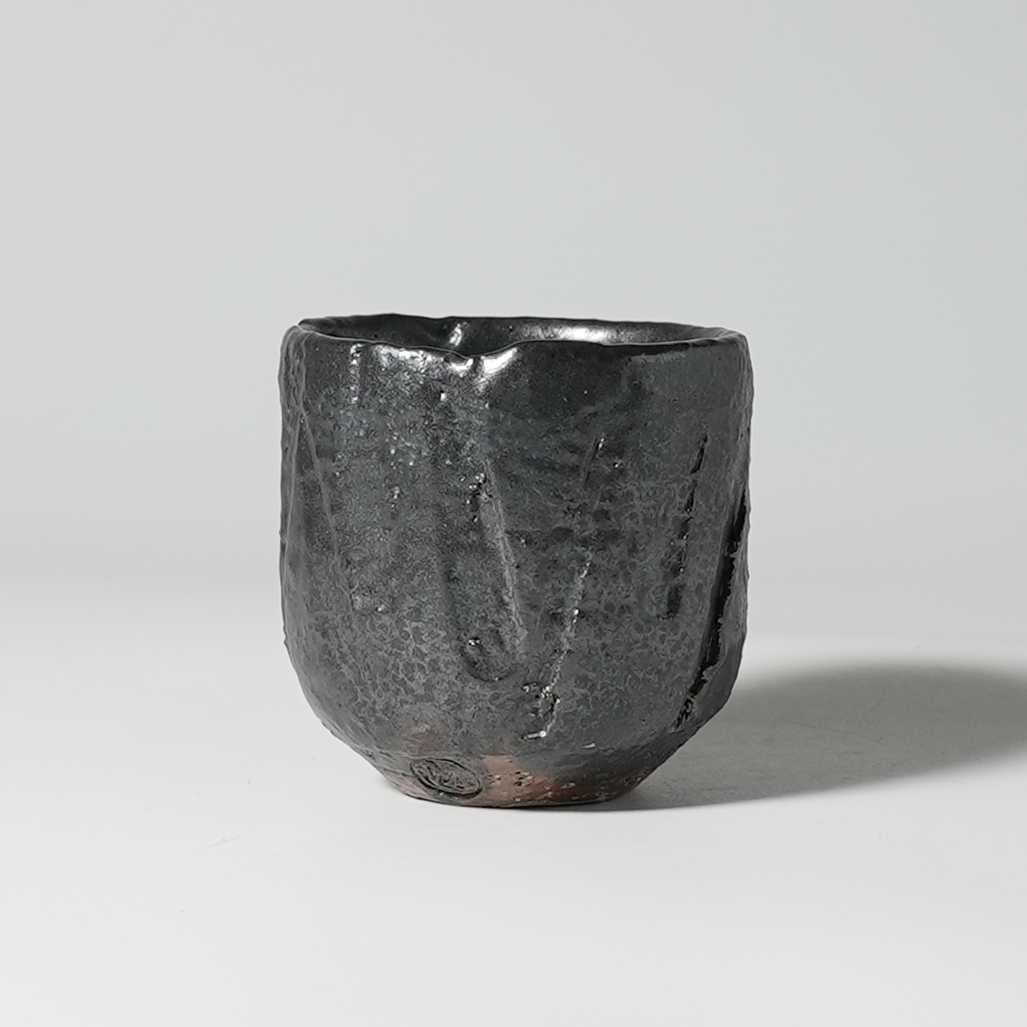 Hagi guro black guinomi sake cup, wooden box. Yu Okada. Hagiyaki.
