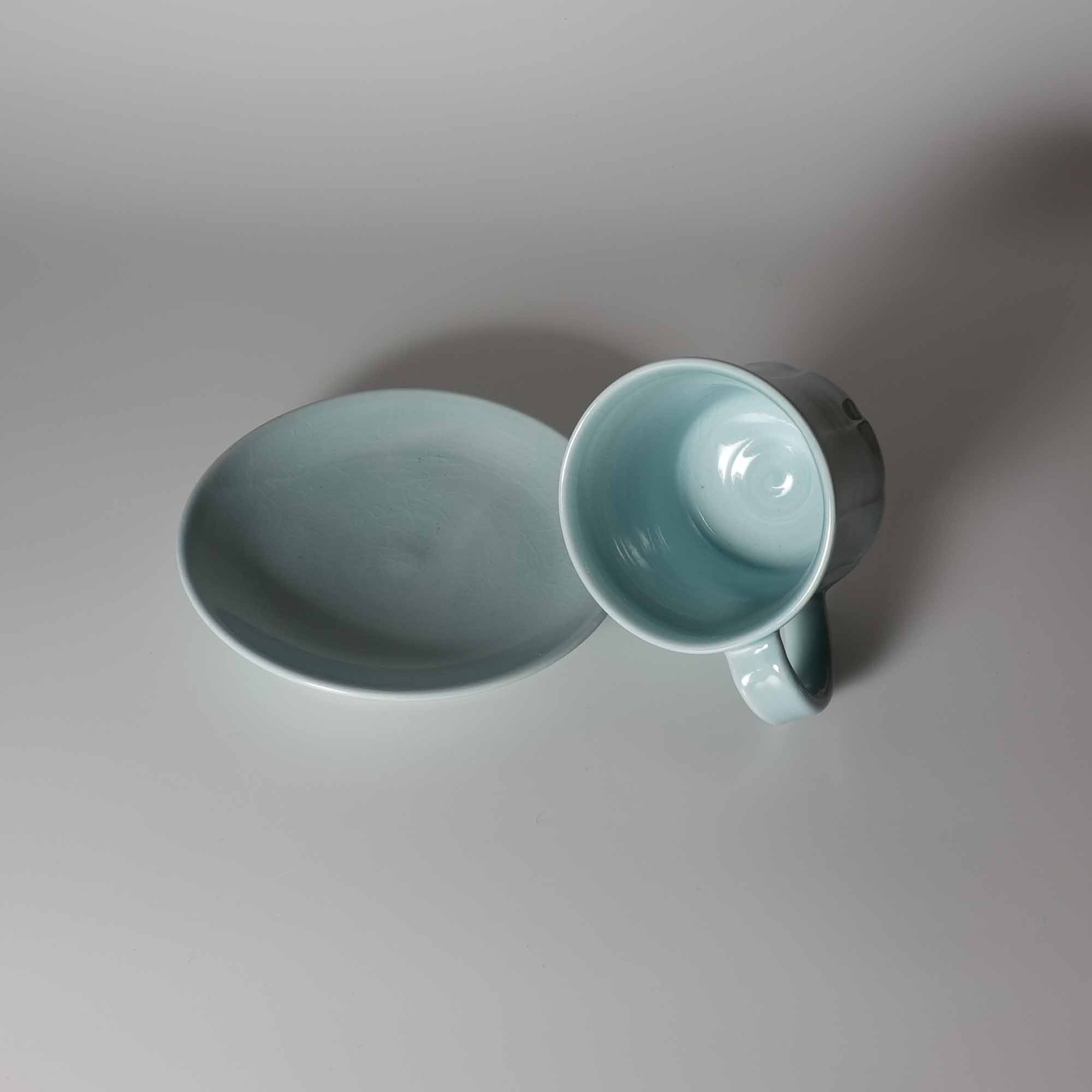 Blue mug cup and saucer. Tohru Funasaki. Hagi yaki Japanese ceramic.