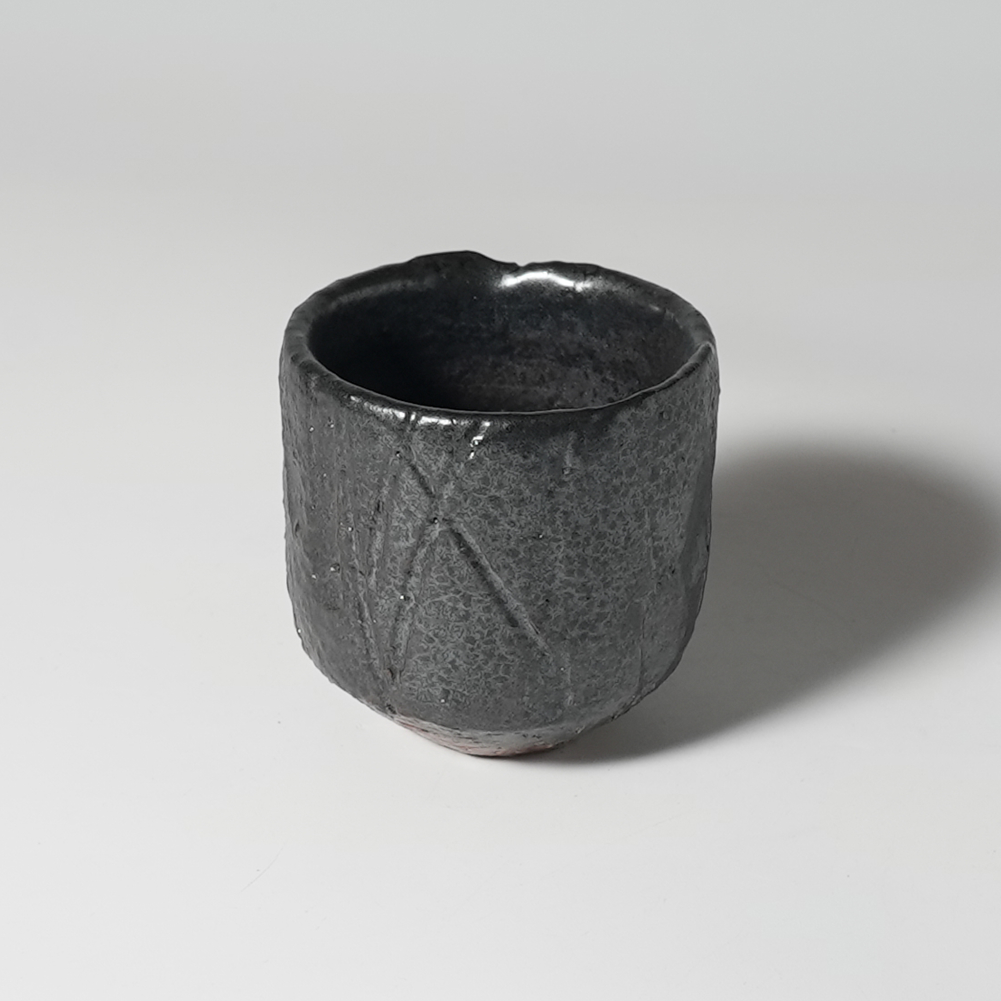 Hagi guro black guinomi sake cup, wooden box. Yu Okada. Hagiyaki.
