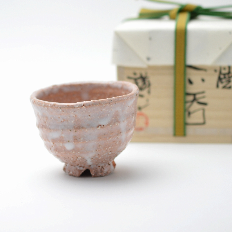 Japanese ceramic Hagi yaki (Hagi-ware) made by Kohei Tanaka. Guinomi Sake cup with wooden box.