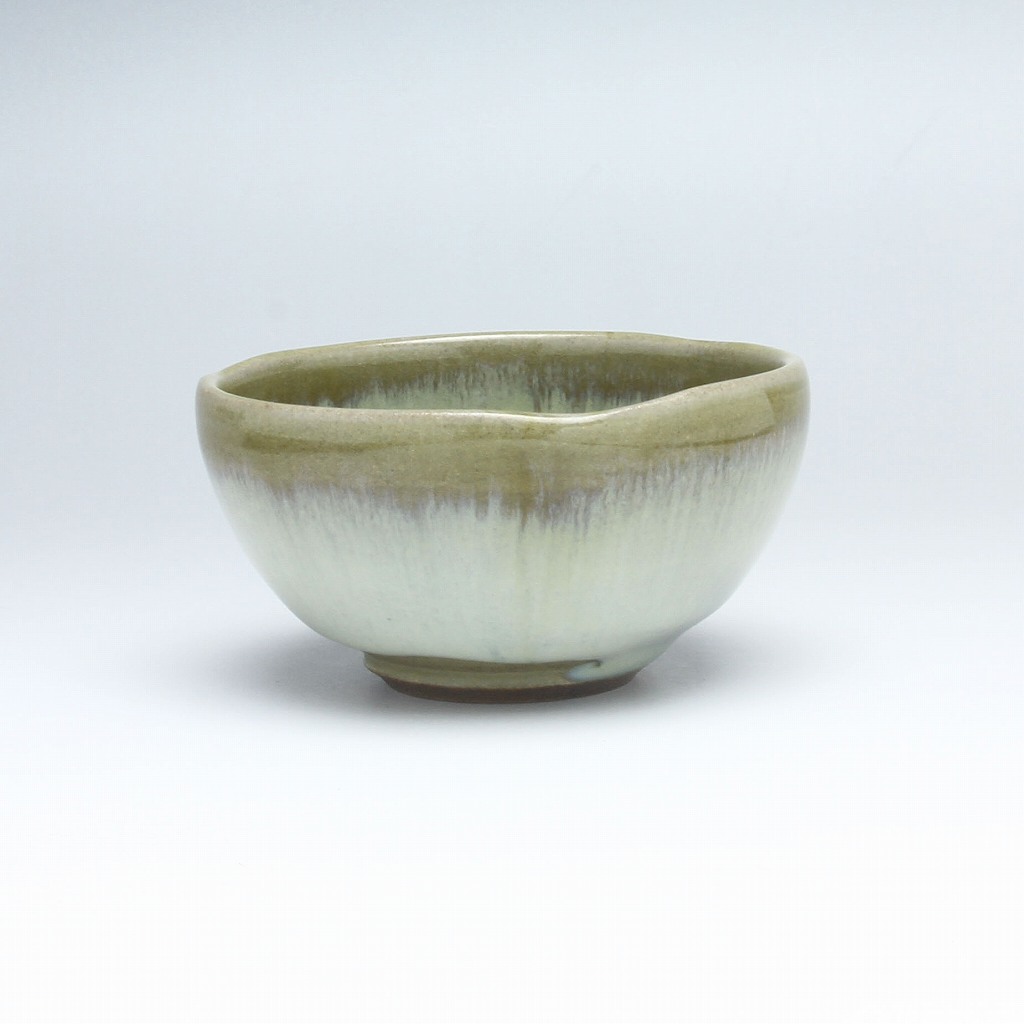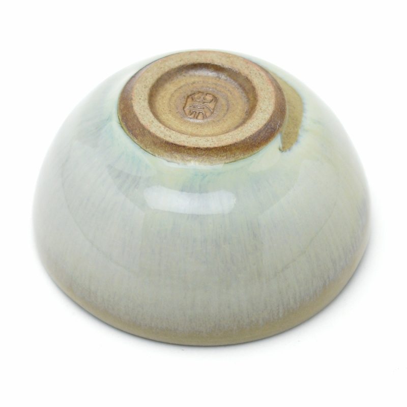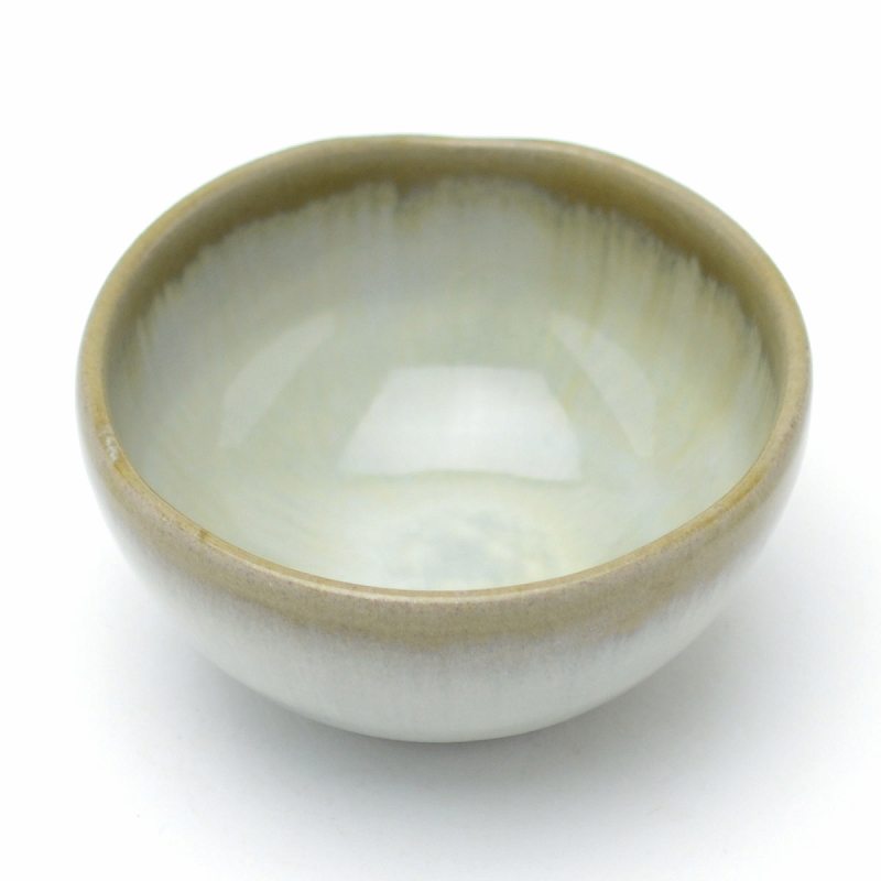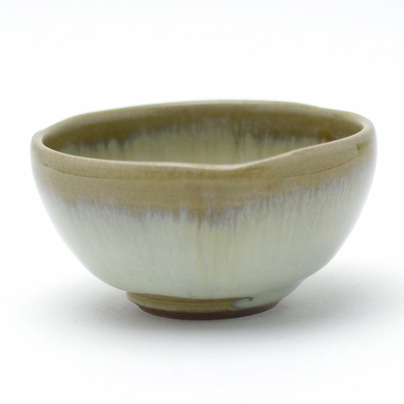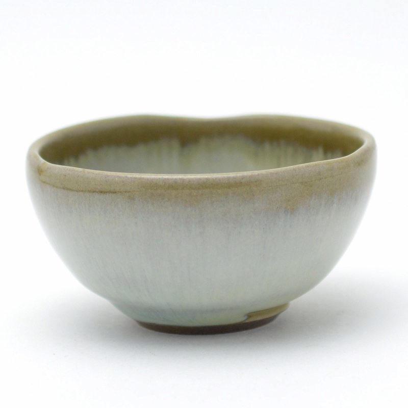 Hagi yaki Japanese ceramic. Flowing white guinomi sake cup with wooden box made by Takao Tahara. Hagiyakiya