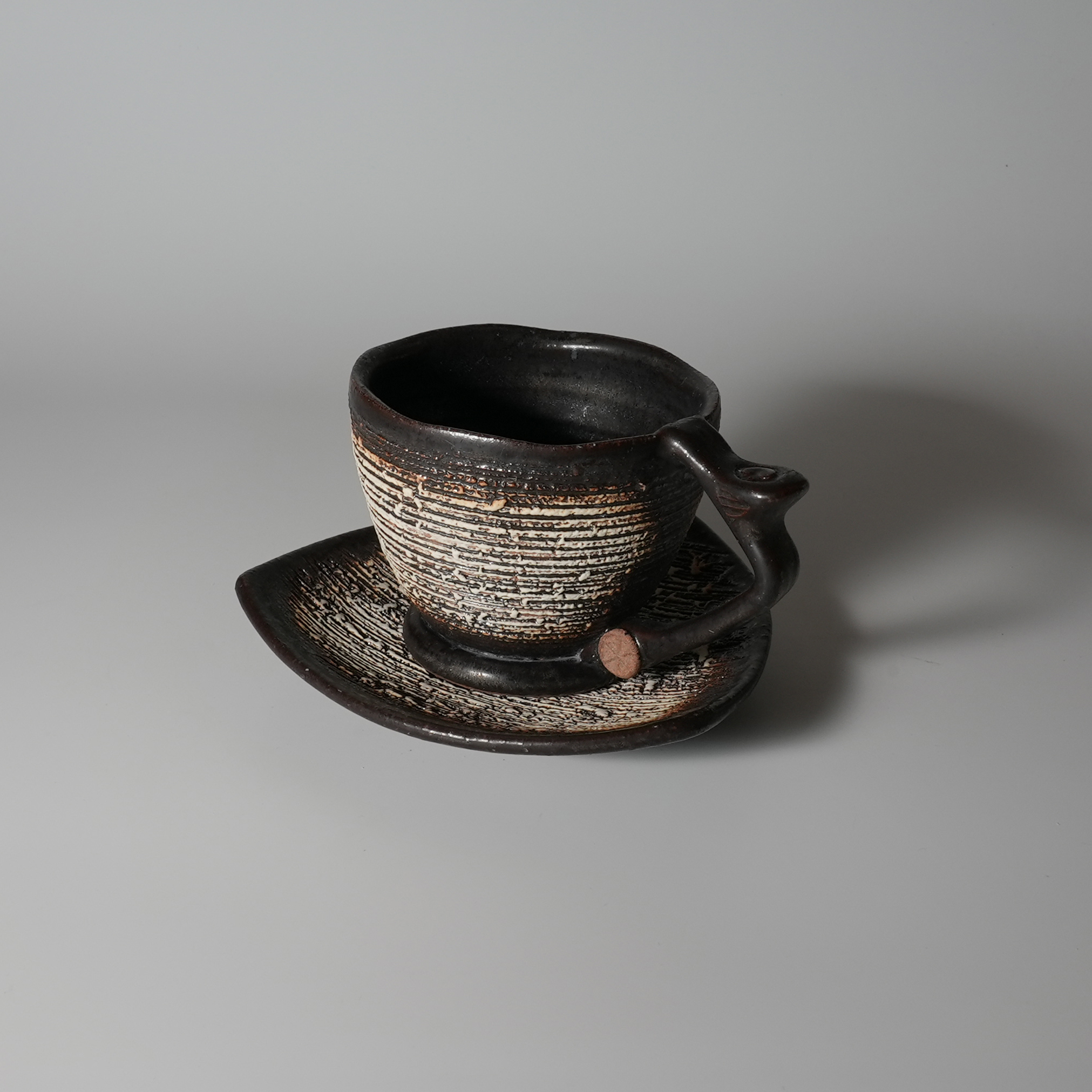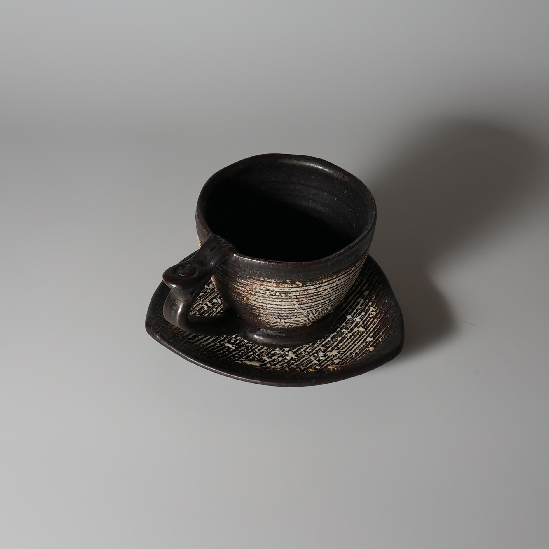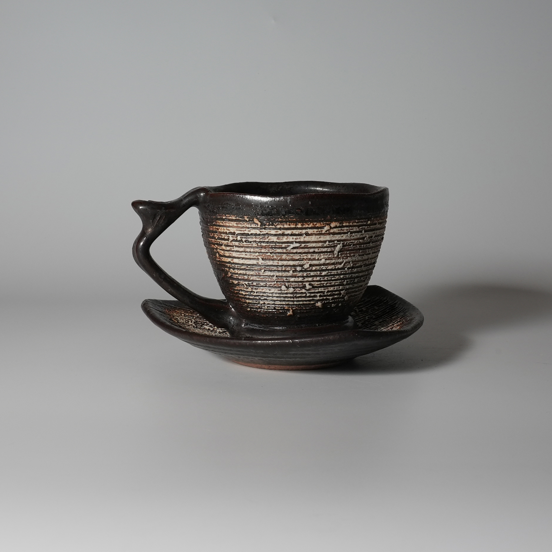Black coffee cup and saucer made by Tairei Tokimatsu. Hagi yaki Japanese ceramic.