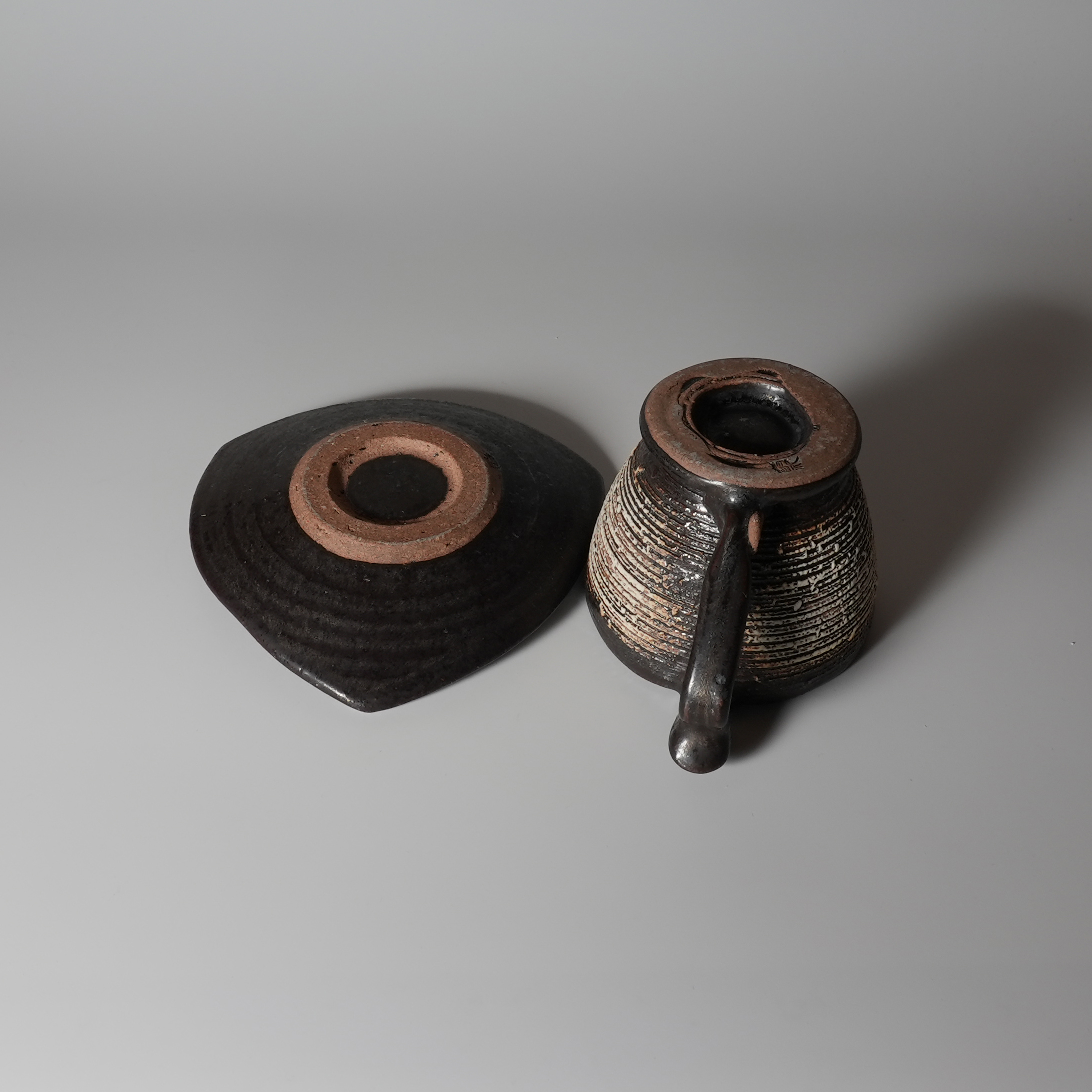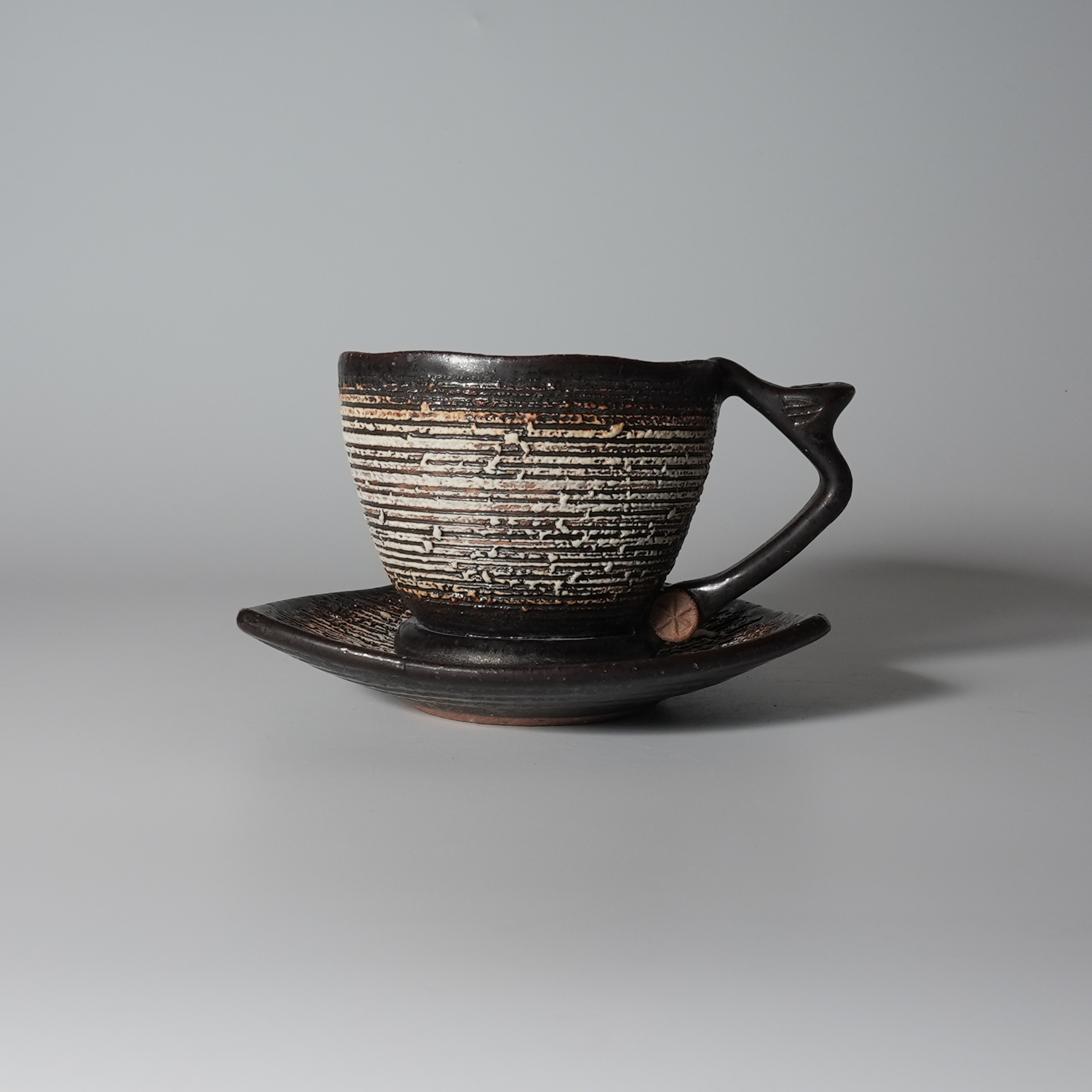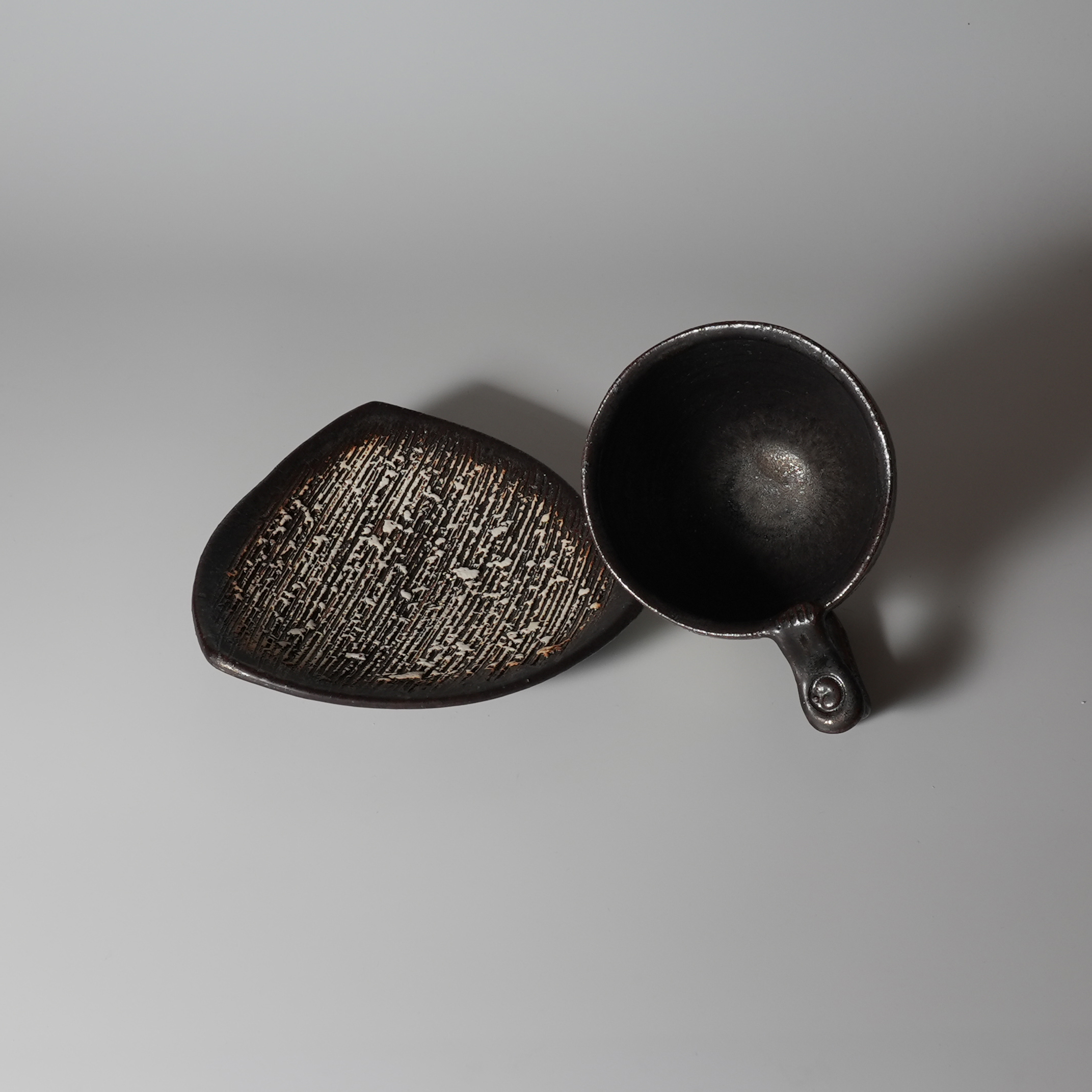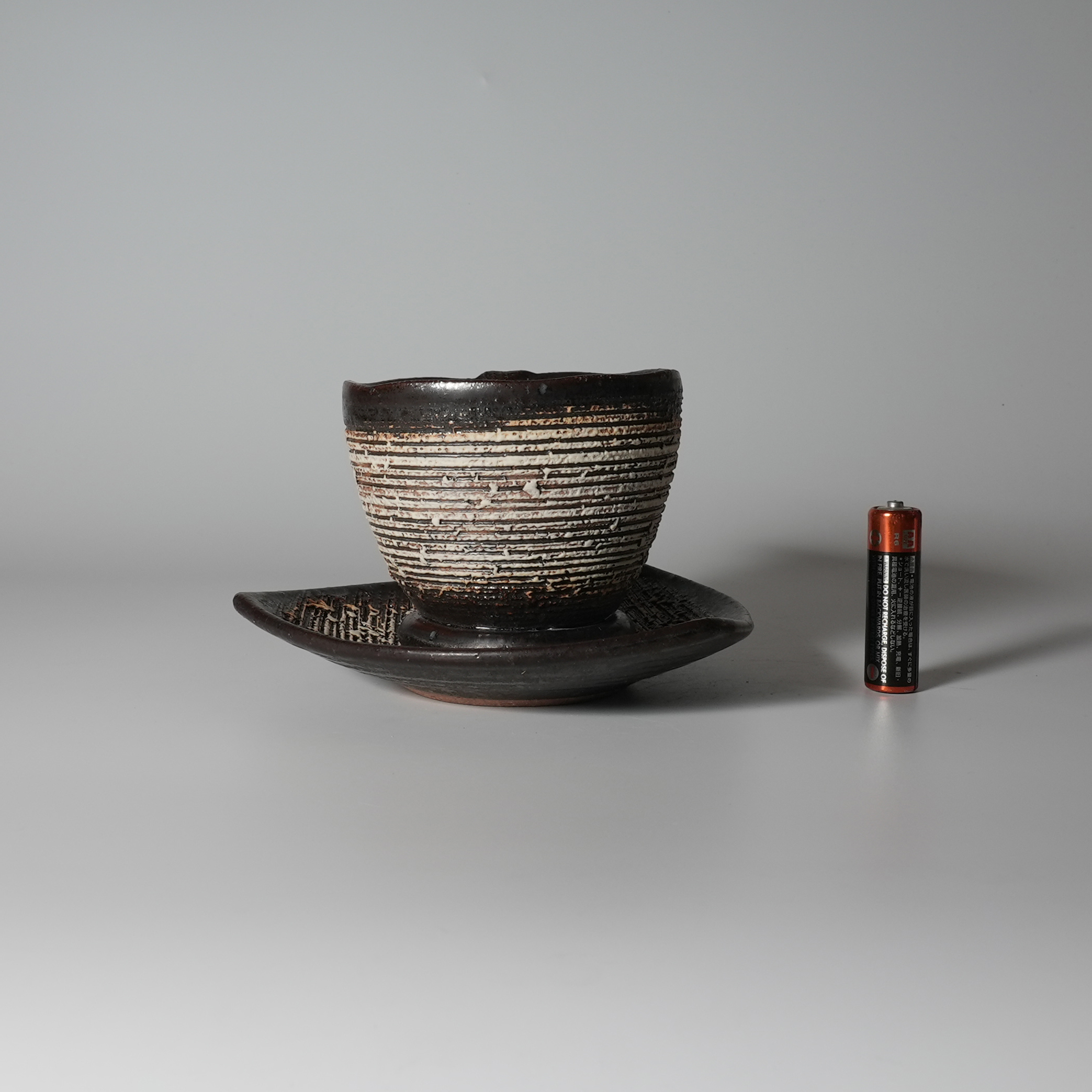 Black coffee cup and saucer made by Tairei Tokimatsu. Hagi yaki Japanese ceramic.
